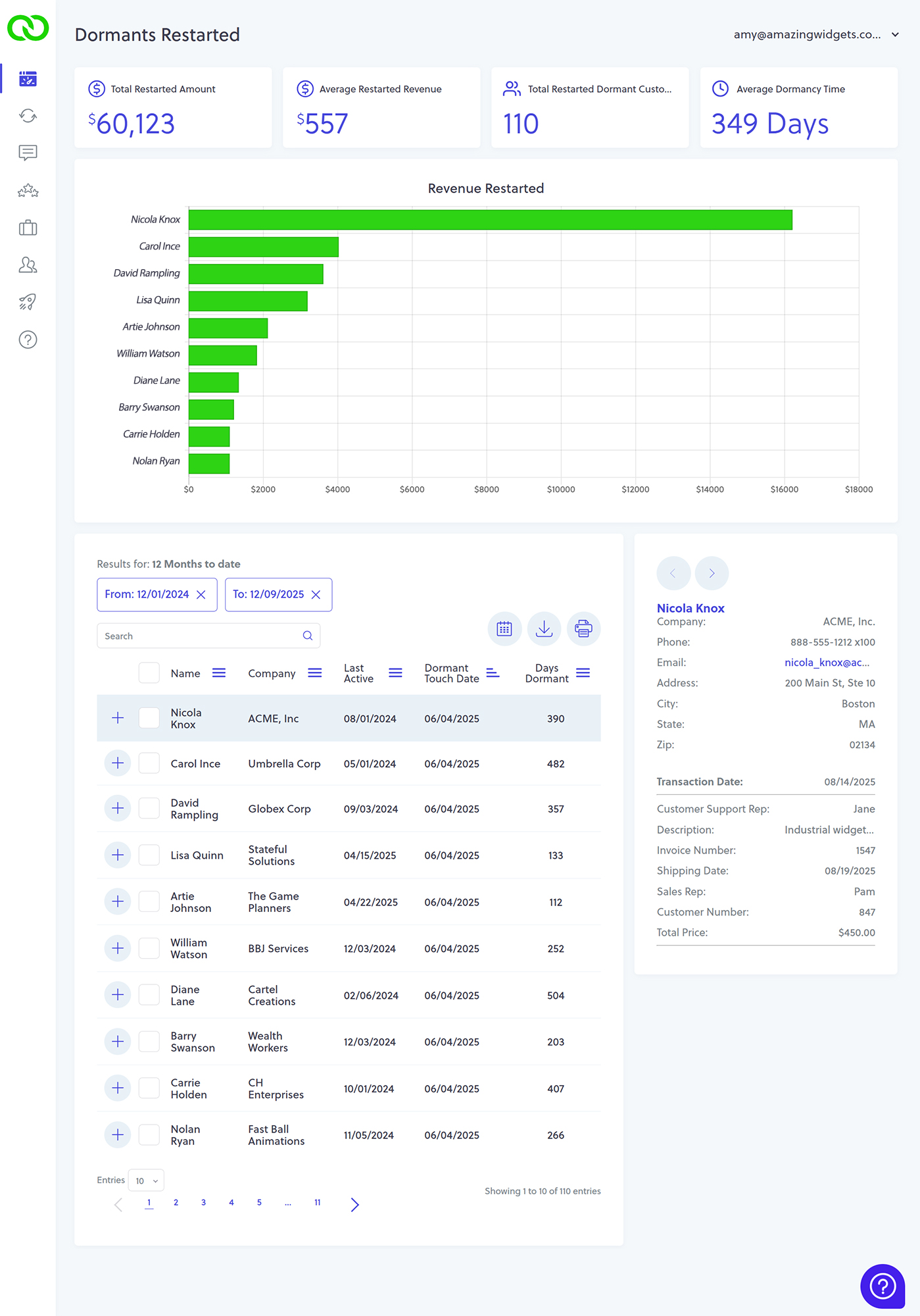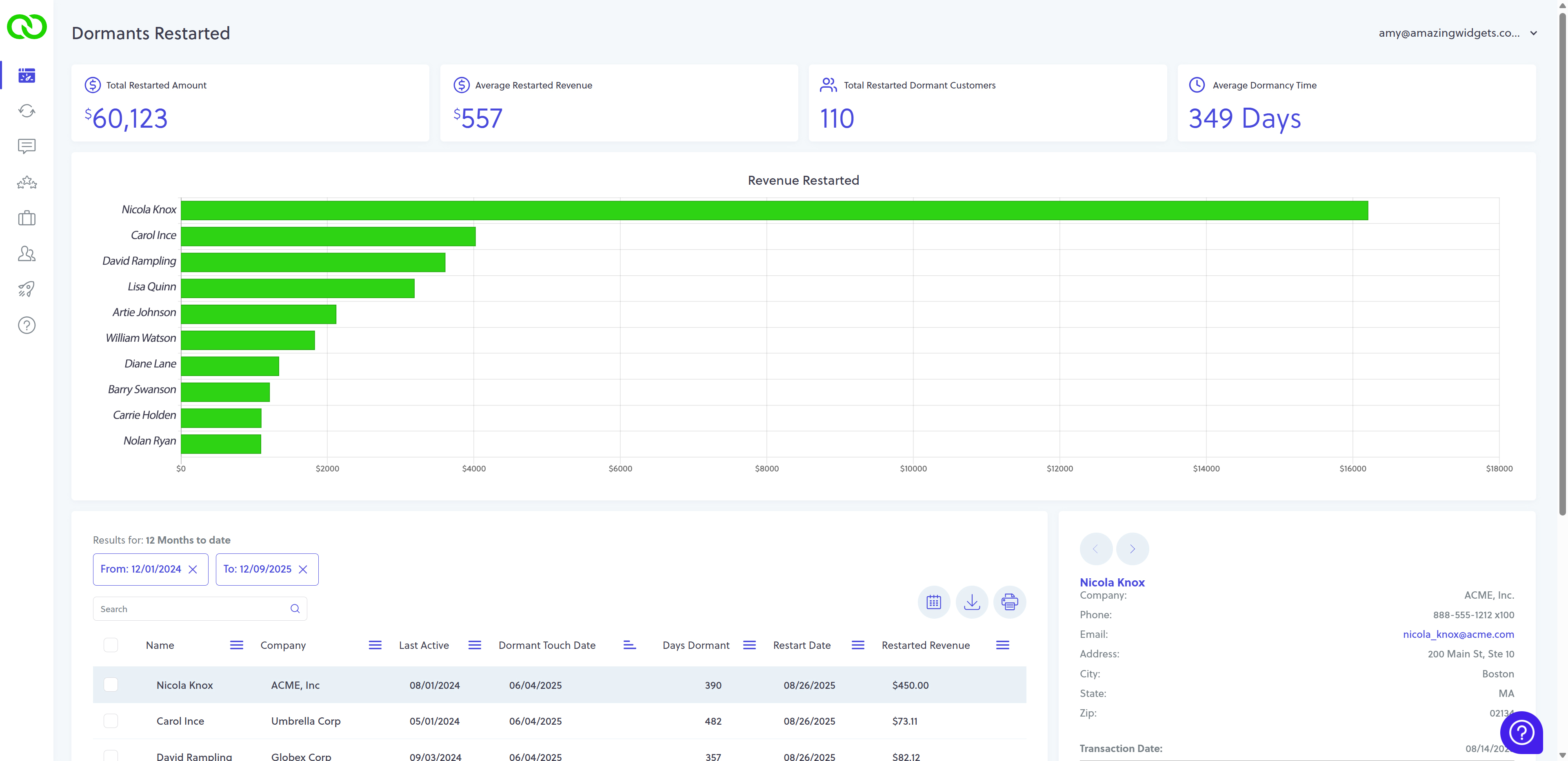 The next section features a chart displaying the top 10 contacts sorted by restarted revenue. At a glance, you can identify which high-value customers have returned to purchase following a dormant period. You can hover over the bars in the chart to see specific revenue totals.