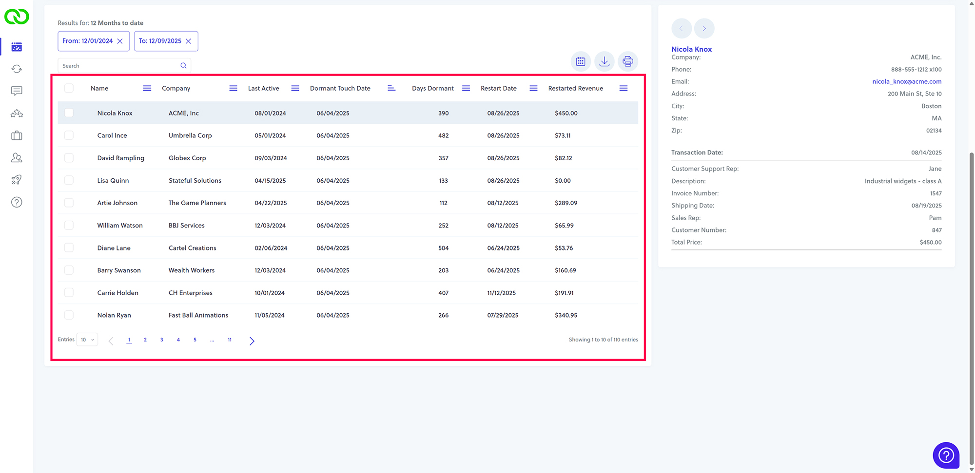 - Days Dormant: The gap between activity.
